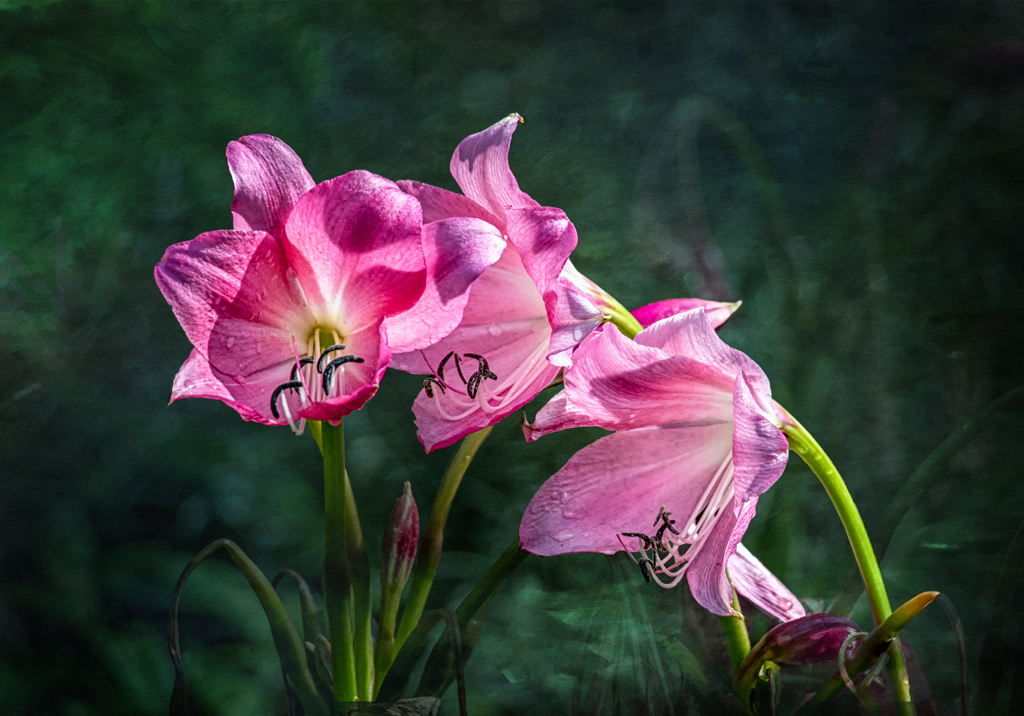 I decided to redo the entire image for this month. I added a different texture and refined the flower selection, since after Witta's comments I magnified the selection radically, and applied a mask to correct the jagged edges of the selection. When applying the new texture, I decided to leave it with a bit of transparency, in order to emphasize the background as a background garden (flowers hopefully seen as those curves Witta mentioned, and foreground flower bud at bottom right, as Mary mentioned. To me, it just looked better than having solid textural background to the main flowers. |