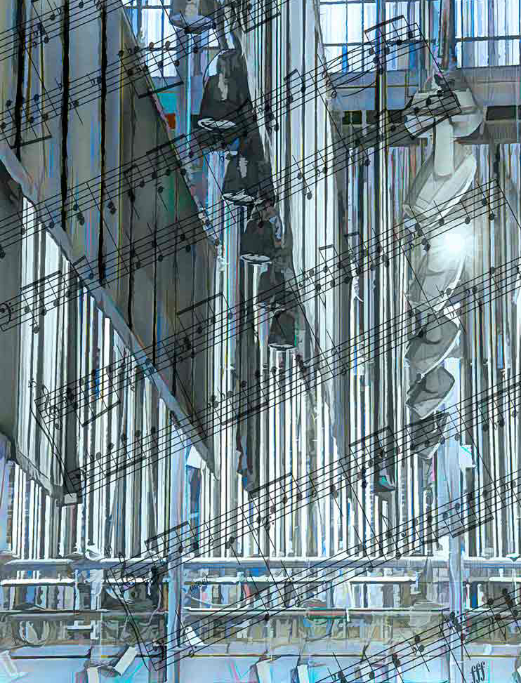 One thing I'd try, if it were my image, is to change the opacity of the top and bottom musical score, and to fade the edges That way it might look more like the music is floating across the 'room'. |