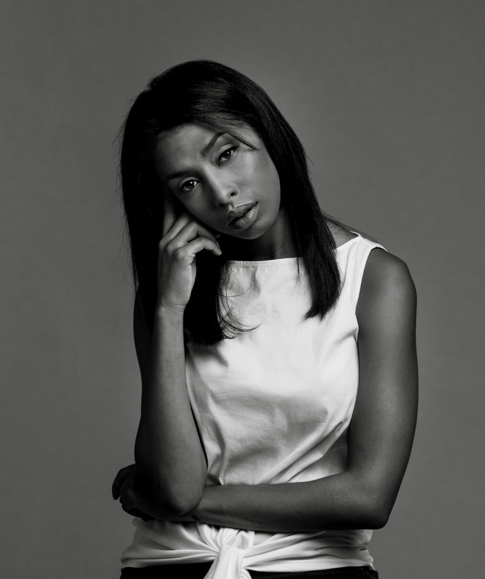 You might want to consider softening the lighting a bit, as to me, the light on her lit side is a bit harsh and the light on the other side of her face is too dark. Also, a tighter crop would eliminate what is to me, the extraneous stool.