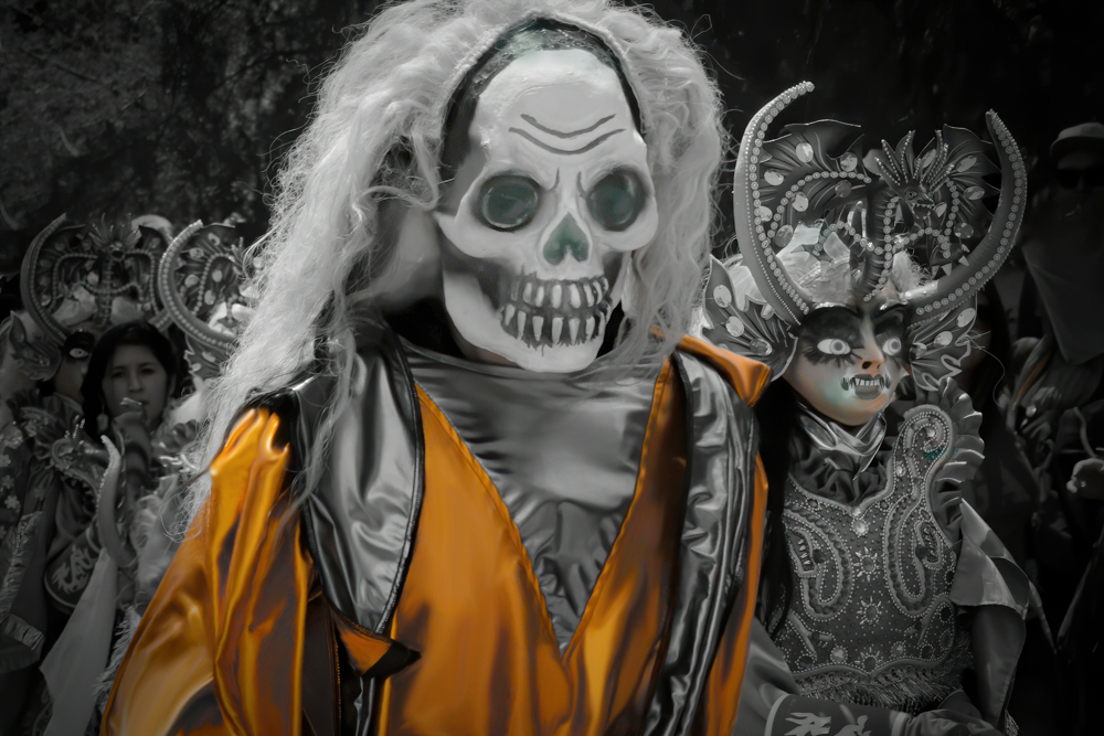 This is a really cool image! I do love the monochrome with a color treatment. If this were to be entered into a competition for monochrome, with one color, you would have to do as Cecelia has done, and remove all other colors except the orange, in the image. However, I do like the slight color in the lady's mask.