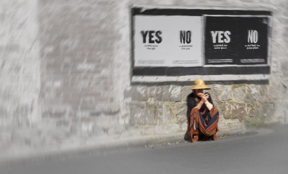 This is a very emotional rendition. The choice to move the woman to the center of the sign was appropriate and well done, in my opinion. The effect of her crouching under the sign, along with the wording on the sign, has a lot of impact, to me.