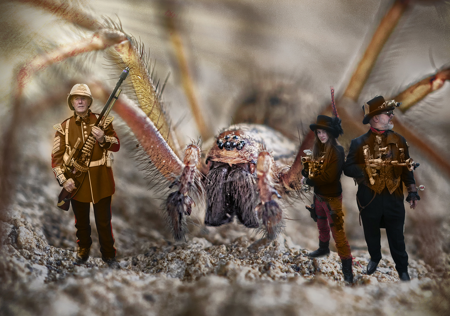 I added a texture in a color that harmonizes with the background and spider. The texture layer is at 100% in Color Blending mode. I added a layer mask to the texture layer and inverted it to black, and then painted with white over the outfits of all of the people. Finally, I added a Brightness/Contrast adjustment layer, inverted it to black, and painted white over most of the spider, to increase the brightness of the spider and make it stand out as the primary subject. |