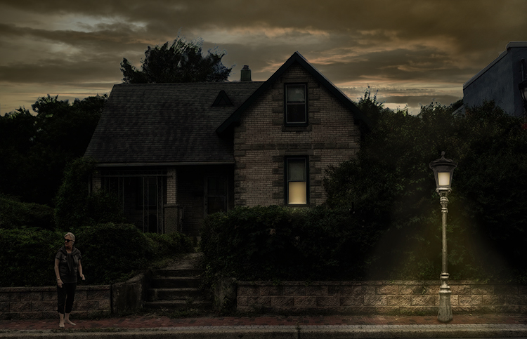 To me, there should be some light on the hedge in front of the illuminated sky. Also, there should be softer light at the edges of the illumination from the street lamp. I added those and used Edit > Sky Replacement to select a new sky. I changed its brightness to about zero and upped the yellows in it. In PS, I also picked the green color from your street illumination, and added a Solid Color adjustment in Color blend mode at 47%, to change the sky to a foreboding stormy green color at dusk. |