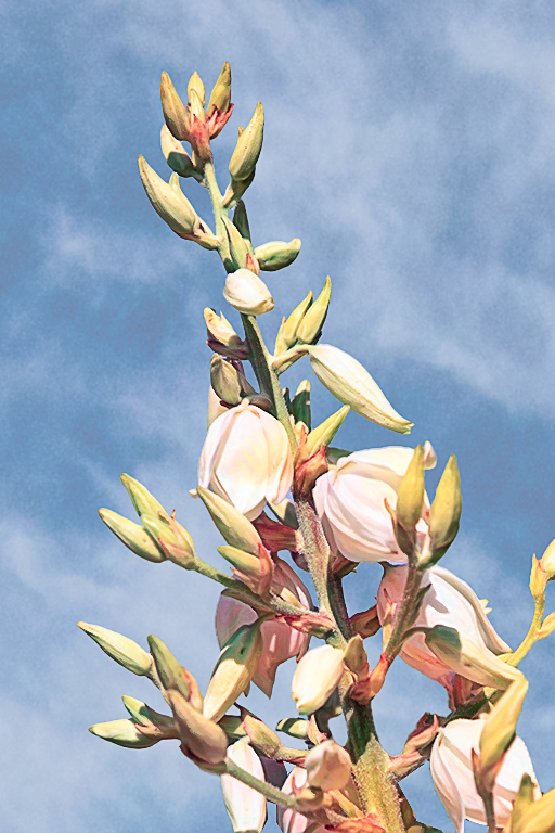 I cut out the flower from the original, using the Object Selection Tool in PS along with some tidying up using the Polygonal Lasso Tool. I used Ctrl J to copy that selection to a new layer. Then I inserted a sky image beneath the isolated flower layer, along with a solid color adjustment layer beneath that. Then I applied the Watercolor Lady preset to only that flower layer.