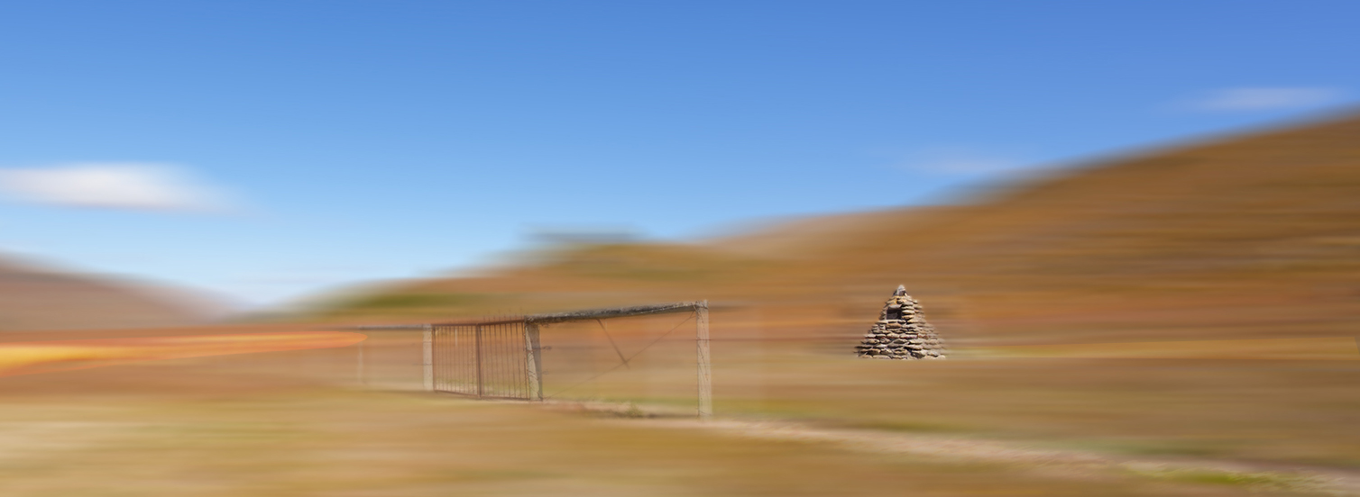 I did something similar to what Jan did. I cropped it a bit more radically, into a panorama. But to capture the direction of movement in the image, I highlighted a few lines and added the rocky walkway leading up to the fence.