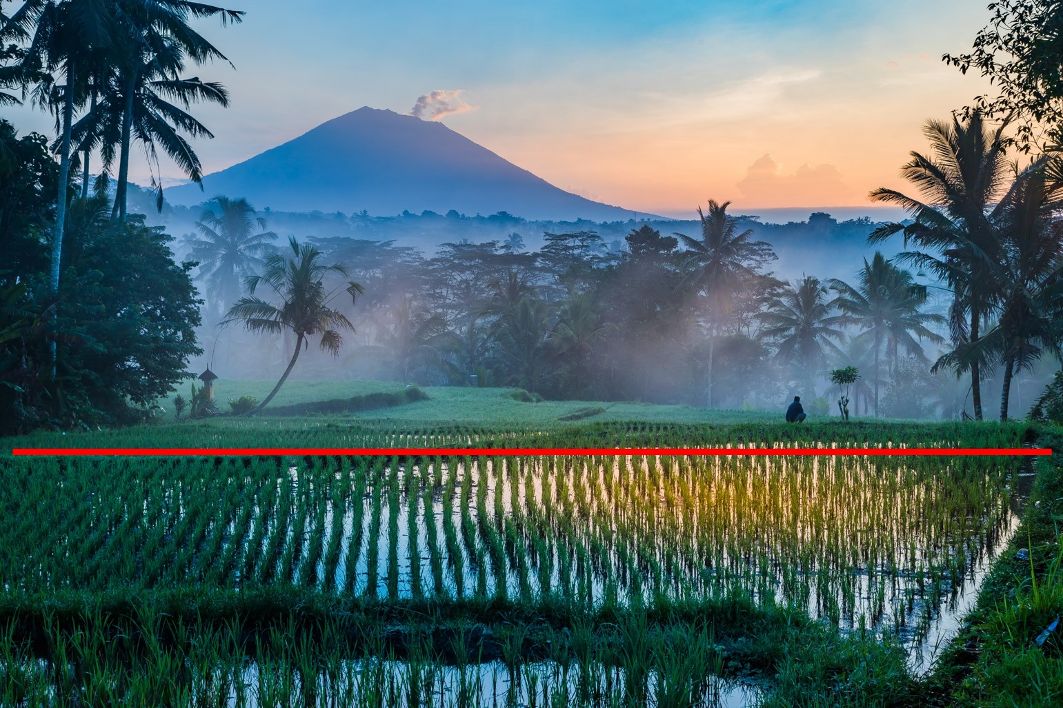 One of the judges commented this is a typical composition so called 'two pictures in one frame'. You almost can draw a divider line to separate between colorful sky and mountain vs rice fields. A good composition merely focused on one particular subject.