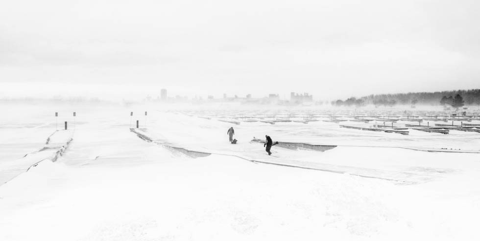 My suggestion. I would darkened the white spot on top of the left hill which was a bit distracting. Increase the shadow a bit to light-up the dark areas. And, if time permits I would wait until the boat get into the water way and brightened the boat trail like the red arrows.
