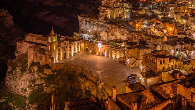 To me, the main interest area of your image is the Church of San Pietro Caveosa with its piazza and overwhelmingly bright balloon like sign. I suggest you crop just this main interest area.
