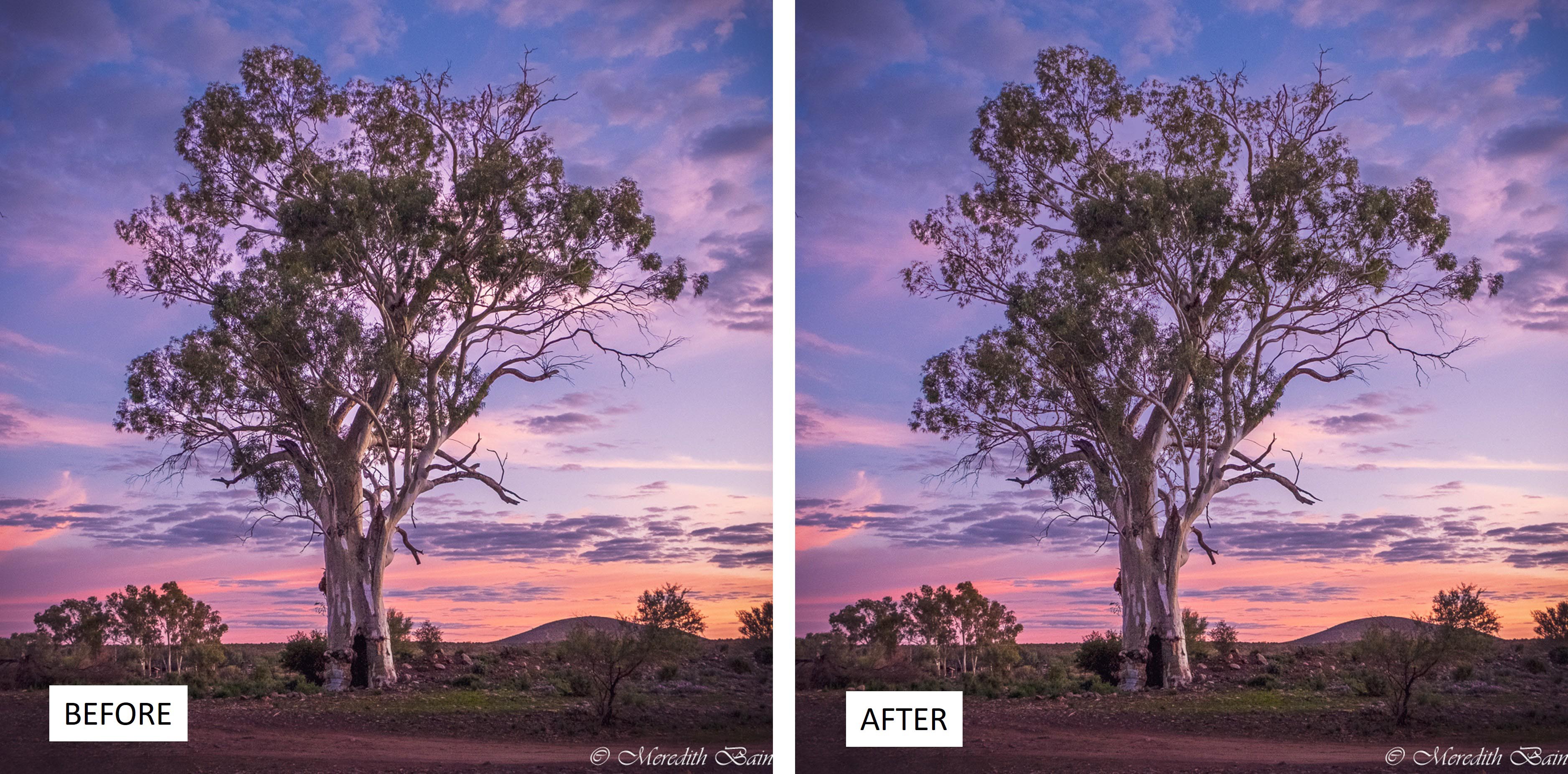 Hi Meredith, this is really awesome. I love the mood you try to present to your audience. If you don't include your your original. I would have thought you did sky replacement. I saw a bit of Halo (bright outlines) and fringing (color bleed) that normally happened as a result of sky replacement in PS. I saw it a bit from original and it's getting more obvious after post process. I experience the same (many times). Because I love vivid, vibrant and saturate sky. I normally perform a bit of touch up to reduce the effects by using Luminosity Mask. I purposely make it too obvious for easy comparison. |