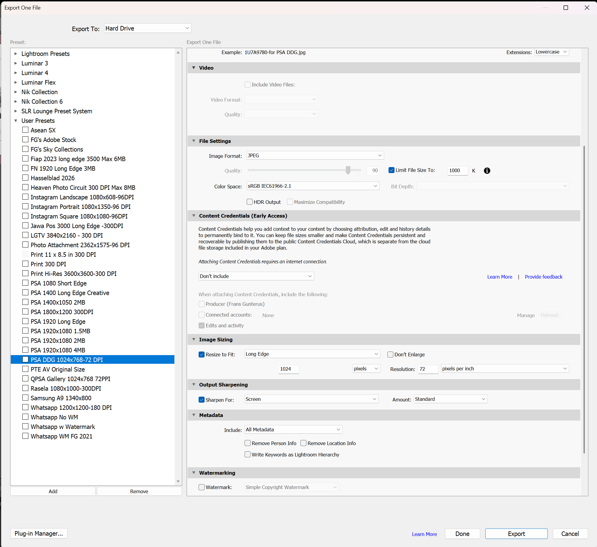 Hi Jerry. I have been struggling - for a while - in this image quality issues for posting in PSA systems. For this DDG, I always use LR to export my image for submission. My setting is 1024x768-72DPI. Copy of my LR export panel is attached. Hope, this helps. |