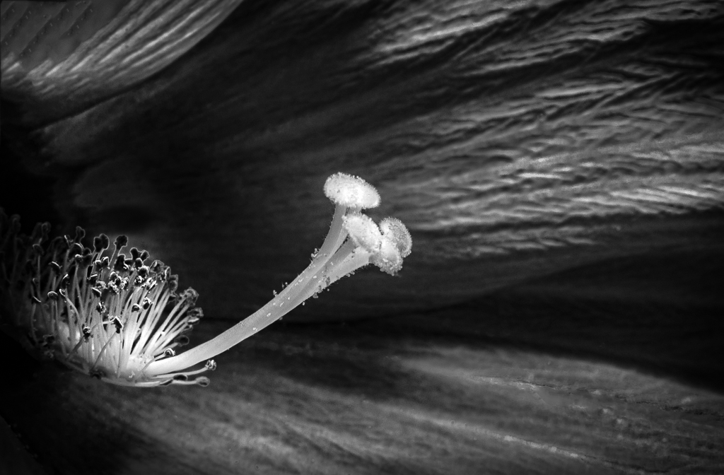 The stigma on the Hibiscus reminded me of a snail with the stigma being its antennae. So, I highlighted the stigma and stamen to focus on my make believe snail. I then just used the radial brush tool in LR to expose and under expose the areas and a slight vignette. |