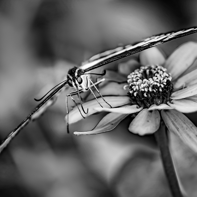Converting a butterfly to B/W actually really good. I did one recently but I didn't have the killer angle, very creative and interesting. I like your conversion of the B/W, however, the edge of the flower gets very dark and become a bit distracted. My crop version is a 1x1. |