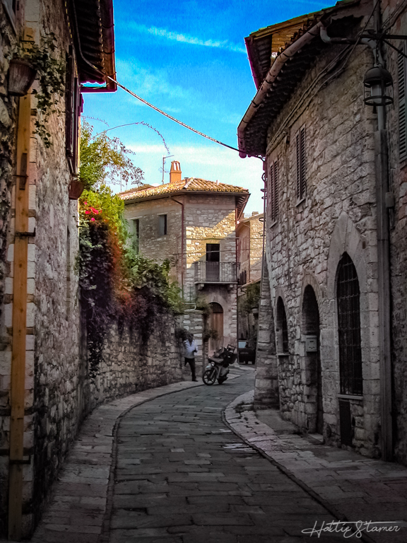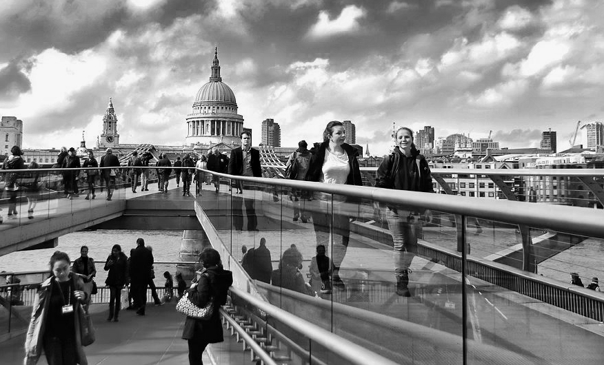 The image does show some hustle and bustle of the city but also too busy. There is also too much of sky and too much everything. I like seeing the two people in the upper level and two at the lower level.