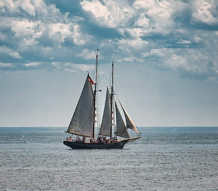 Beautiful Schooner. I once sailed from Mackinac Island to South Haven Michigan on a replica of Schooner America as one of the crew. Got to help raising sails, and steer. Great Fun. The schooner is the subject of the image, I find the other boats distracting. Also, image is overly blue. I made a few edits that demonstrate what I'm suggesting. BUT, if your objective is a photojournalism type photo or vacation record, leave them all in - just change white balance. |