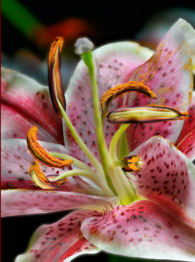 Hi Neal, great focus on the leaves, and the pollen is wonderful. Somehow the focus on the stigma is not sharp. I would have the background darker around the leaves to allow the white borders to pop. Also, I am attaching the image rotated to a position I personally think enhances the composition. Nice shot! |