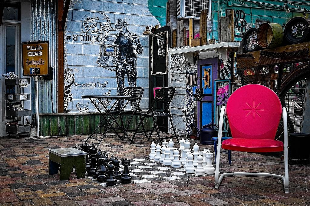 Very nice street scene that I feel works very well in color. There is a lot of detail in the photo and I find it is well exposed. My eyes definitely move around and ultimately end up on the chair, which I see as the focal point of the photo. As it does have a very "clean" look to it, I feel that the armrest or leg on the right could be lightened to match the left leg which has a brighter look. |