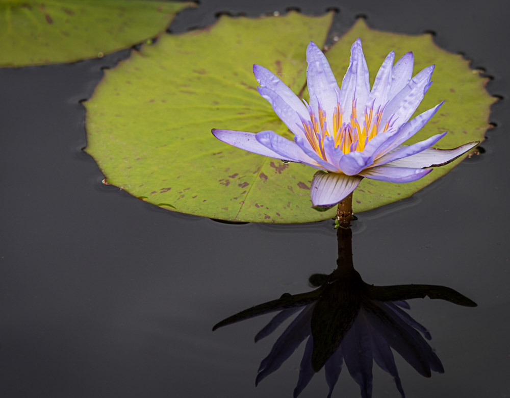 I find the debris in the water distracts from the image. I edited the image in Lightroom by cropping out the leaf in the bottom right and decreasing the black (-21) to darken the water and flower shadow and adding a slight vignette to help emphasize the flower. I used the spot healing tool in Photoshop to remove the debris from the water. |