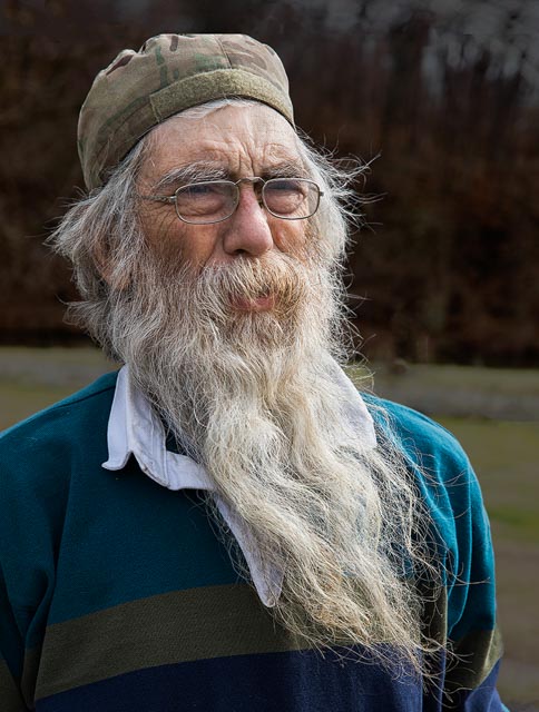 A great subject of a "Grizzly Old Man" photo. I really like the bokeh and the detail in the face and beard. You can't really see the mouth, but he seems to have a kind of pinched, worried expression that gives the viewer pause to wonder.