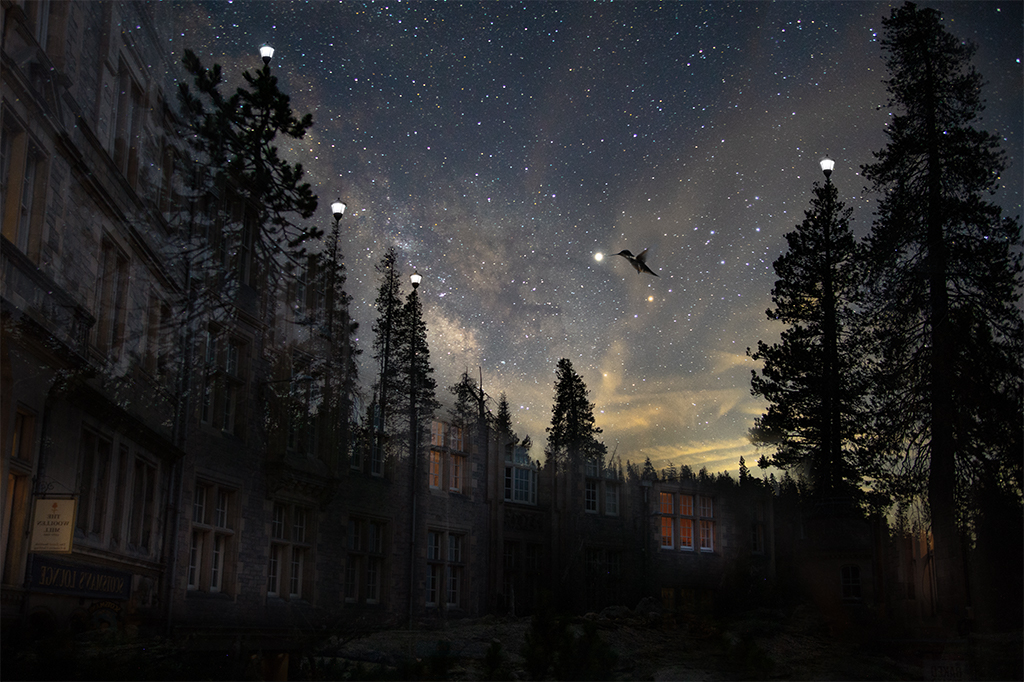 Aavo, I added the bird as I was trying to create some visual movement towards the right side of the image. After the bird was in the photo I wanted to suggest why it was there. As I look at my image now I do see how I've added too many elements. Since this is a surreal image I wanted to push beyond ordinary logic in the image. I chose the flame for the orange color and to extend the idea of light as the stars are a type of burning fire as is the sunset and in a more controlled way city lights. |