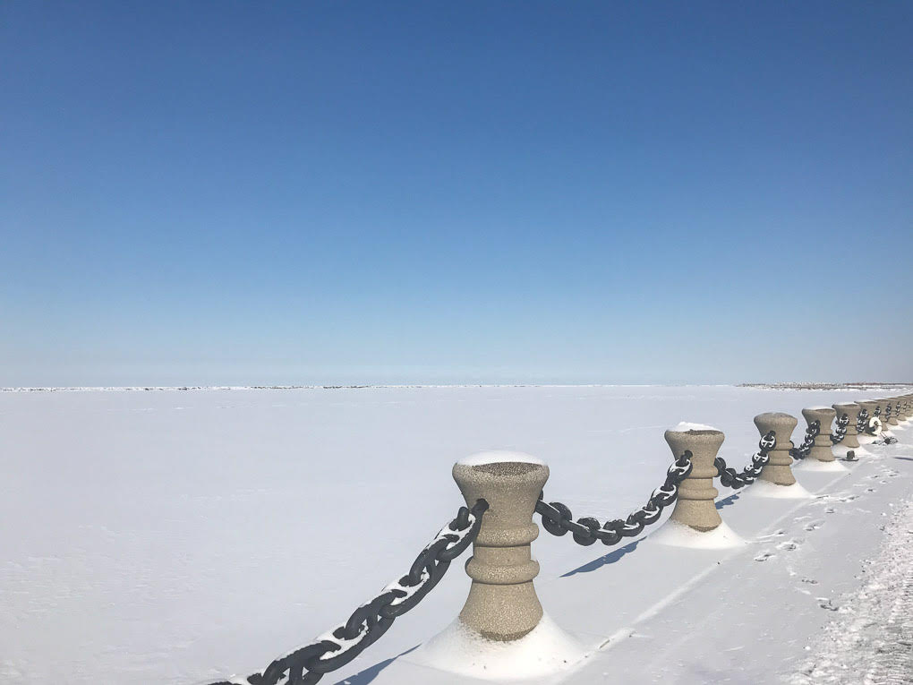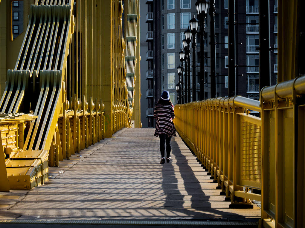 I like the image as it is. The handrail is a great leading line! It pulled by eye into and then through the image. leading me up all the way to the blue.