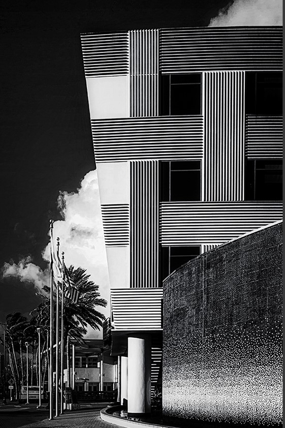 I like your eye on this image Cyndy and I think a little cropping could get rid of the distractions (see attached). The cloud for me is what ties all the lines together and brings out a tonal contrast as a background piece. By cutting off the buildings at the left you are left with vertical lines from palm tree trunks and flag pole and supports columns on the building behind. The US flag adds more lines. The foreground contrast of the arched wall is wonderful as a leading line. Of course, the choice of b&w is excellent. |