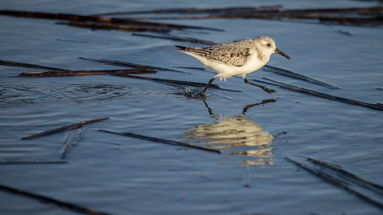 Nice capture and you have a lot of wonderful stuff in this image! First, I'd remove the tower jutting into the sky. You have 9 horizontal lines comprising this image and a pano crop below the reflection of the bird at right would bring these lines into balance. All but two of the vertical areas are rough, so the smooth water in which the birds stand compliment the sky. I think you have a nice image illustrative of contrasts here. |