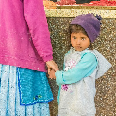 Nice street photography image! I would suggest a tighter crop (see below) since from your description the focal points are the child's eyes and the hands. The crop below has the top 1/3rd line at the child's eyes and the right 1/3rd line along her nose. The crop still maintains the wonderful fabric textures worn by the grandmother in the skirt and apron. The full version of the image tells a story more about the clothing, IMHO. |
