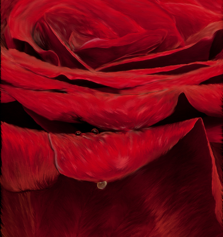 Your rose is lovely and the painting reminds me of a waterfall with the churning waters atop and the rock face below. I have a love for waterfalls and rapids so pardon me for transferring that to this image and my comments transfer that eye to your painting. I have cropped it somewhat differently, from the top as well as the bottom. The flaring strokes of the petal below the major drop is too good to crop out, IMHO. I would have also kept more of the water droplets on each tier of petals so as to replicate a waterfall. But that is because both your original and final images are so inspiring and many versions are possible. Thank you! |