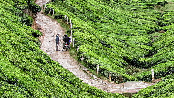 Sanat, There are a couple of stories about the tea plantation here: the buildings and the two people on the road. Which is more interesting, more intriguing? I have cropped the image and attach it below to show how I would present the story of the people on the road. You could further enhance this by some burning and adding a vignette to direct the viewer's eye even more. |