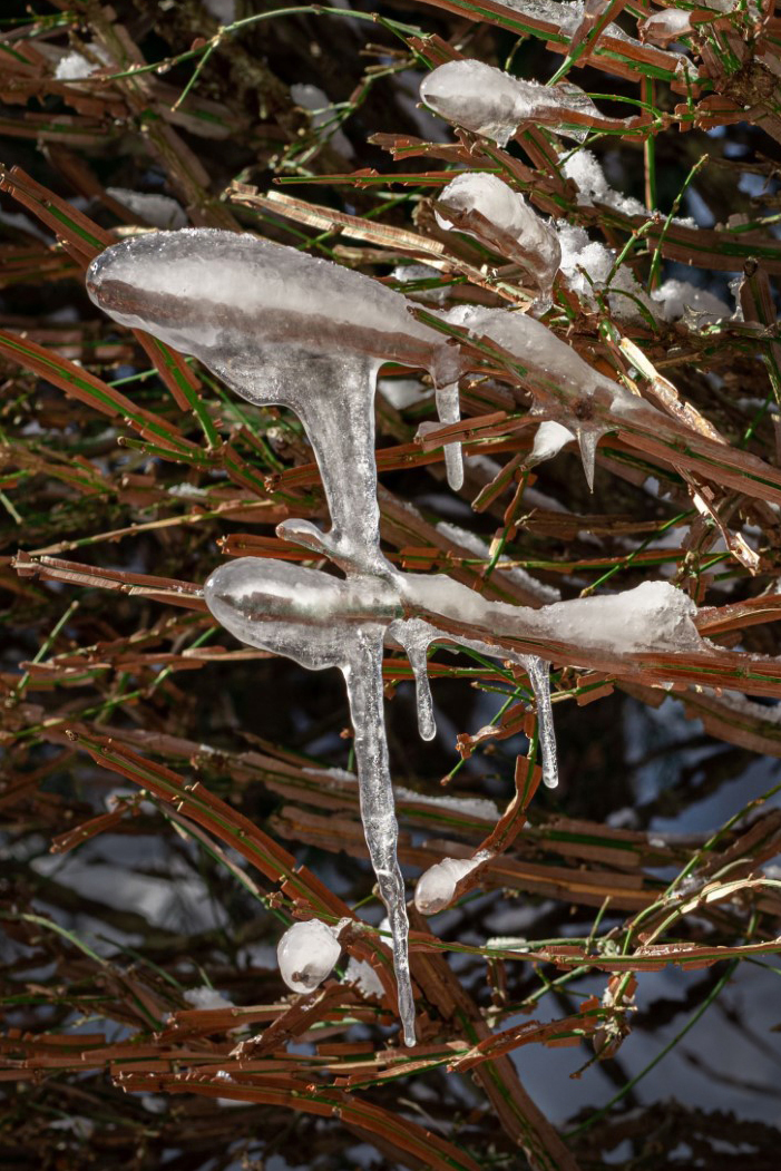 I like the way you increased the green color on this fire bush. My perception challenge was have my eye go off at left with all the strong branch lines leading that way and a large negative space at right. So, I had to find something that was more balanced to my eye. I cropped in more, put the drip line on the 1/3rd line, and balanced the ice at top left with the dark at bottom right. Maybe this helps, maybe not. Fun challenge of an image to work with! |