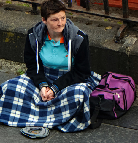 Tight cropping causes tension within the image. This photo is about tension aso I'd crop the sides close too (see image). I also darkened it a bit so her face would show more because that's where the story is. I love the circular flow within the image with her arms pointing toward the cap. Since she's looking right, my crop allowed for more pace at right. Nice street image. |