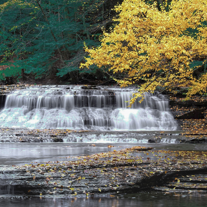 I think that you can have a wonderful image if you lop off a good chunk of the right side. I have attached what I mean. I'd use the rock ledge in the foreground to point to the right side of the waterfall. In LR use some linear gradients for the bottom to darken it, for the top with an intersect for color and adjust the greens. The yellow leaves are wonderful! Can't do much for the blown highlights. Did you use a polarizing filter? If not, try that and use a shutter speed of 16-22 to slow the water to where you want it. |