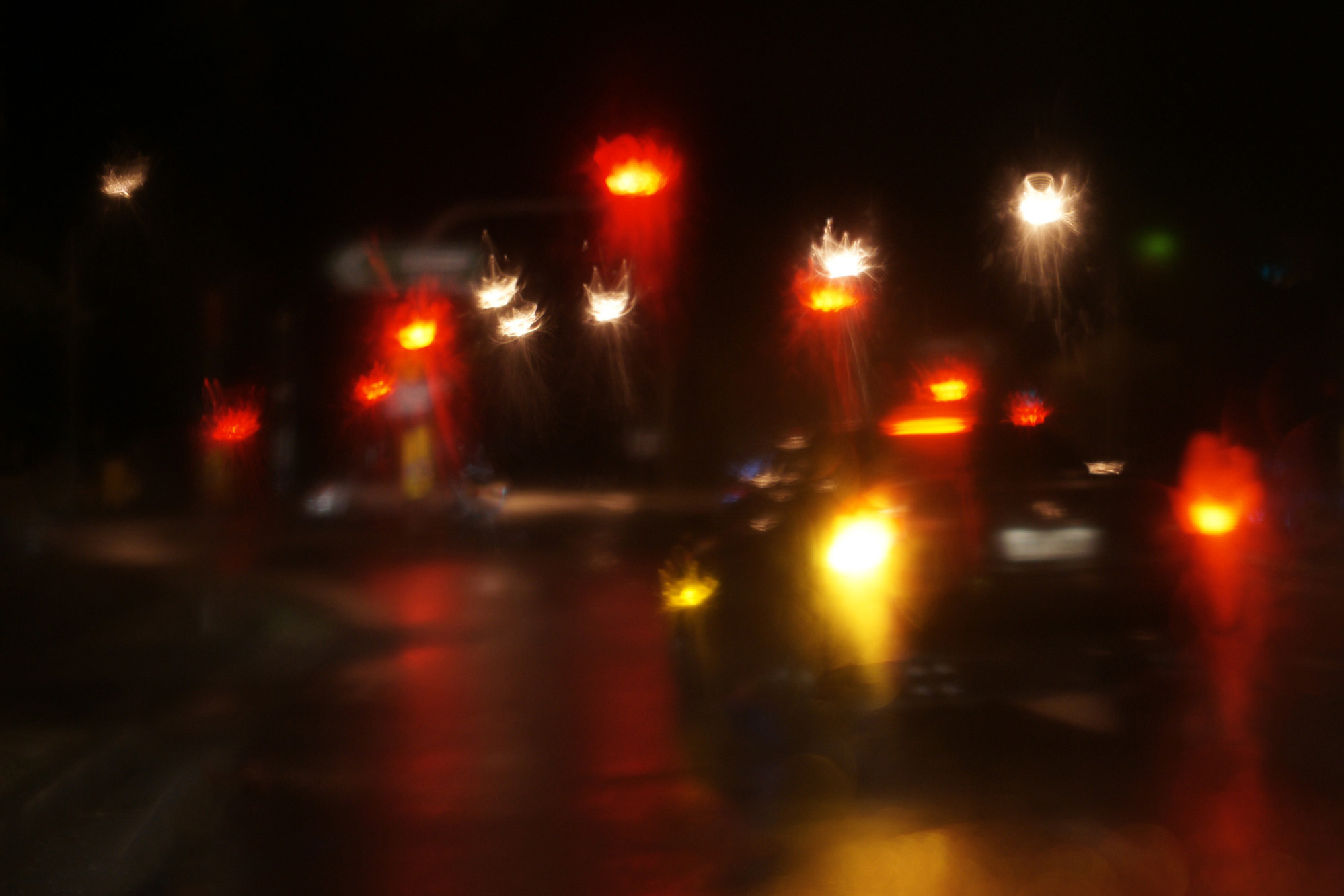 Sitting in a car, alone, at night, in a parking area. Who wouldn't think it was a photographer?! This was a successful experiment and I like the "mood" because it is ingrained in us as something out of a cop show/murder mystery where a car is involved. Why is the car seemingly stopping? What's going on in the darkness of night? Ahh, the mystery of it. My eyes go to the bright lights on the right side first, and so I think are distractions to the subject oof the image. Ditto bright white at lower left. I've attached a cropped version with the left taillight on the 1/3 intersection. I'm going to have to try something like this downtown in our village. |