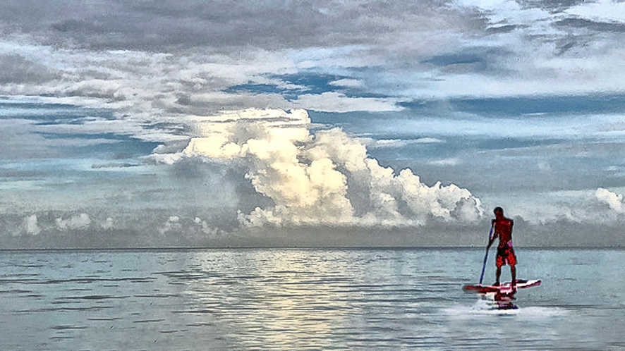 Never thought about how easy it might be to merge 2 images when dealing with an ocean sky! You did this well. IMHO this would be better if you added more area to the bottom by using Content-Aware fill in PS and then cropping down to a 16x9 format. The eye is drawn to the white clouds (which you might bring down the Highlights on so as to not to look burned out) so most of the clouds on top of that formation is clutter - the darker cloud serves as a natural top border area keeping the eye within the image. By cropping to 16x9, you make the paddleboarder more integral to the image. The horizon line needs to be adjusted slightly. A good start a wonderful image! I have attached a quickly adjusted image below. |
