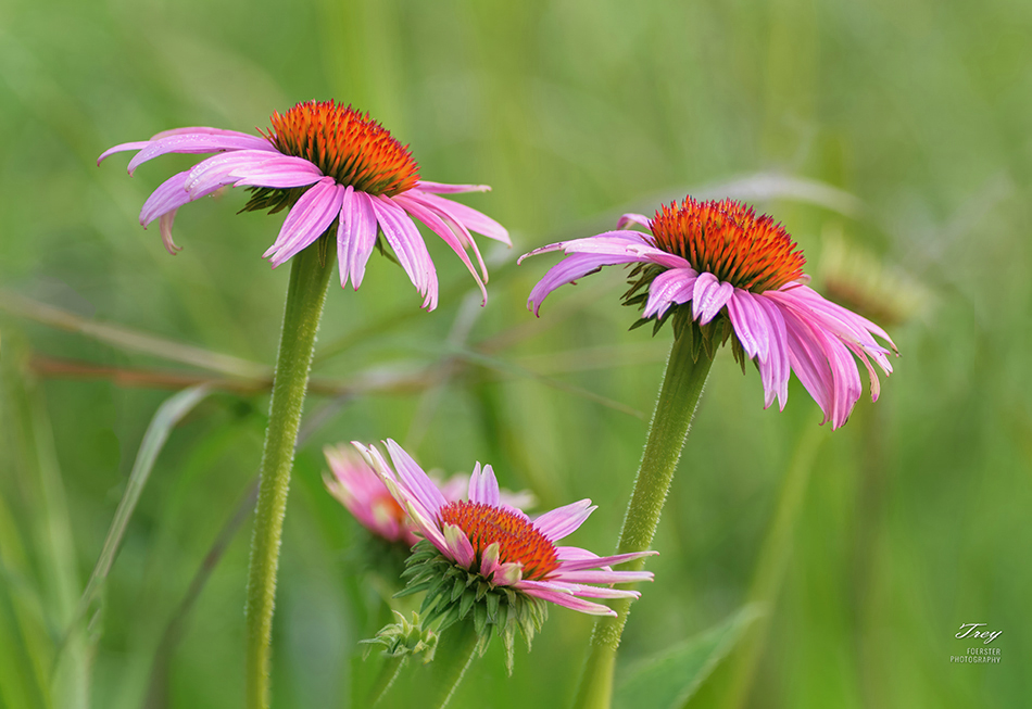 Ian, WHERE I took this will help explain some of your questions. These were taken in a natural prairie preserve for which I have done a lot of work and coordinated funding for through our Rotary club and the local Lions club. (1) three coneflowers are in focus. I could have called it Puple Coneflowers but I feel I must promote treys where I can, two flowers are more mature and the lower third one is a newer bloom. There are 5 coneflowers in this image BTW. (2) Ultimate purpose is to document for (a) educational signage for the preserve and (b) for cards and artwork and possible calendar for preserve fundraiser, not to enter any competitions (which I have soured on at my age). (3) as far as rules, if they fit and enhance the image to my eye, why not? They make the image "comfortable" to the viewer's eye and if they like it they might buy it. One person may not like an image alone on a wall, but put it in a calendar and they love it. My dad had a saying: "Concerning taste there's no dispute," said the Old Lady as she kissed the cow. An old Yale MBA furnitue store owner taught me a lot about marketing when I worked for him for a summer while in college. What is background distractions for you in this image, are background references to people who know the prairie preserve and therefore IMHO provide reference and setting.