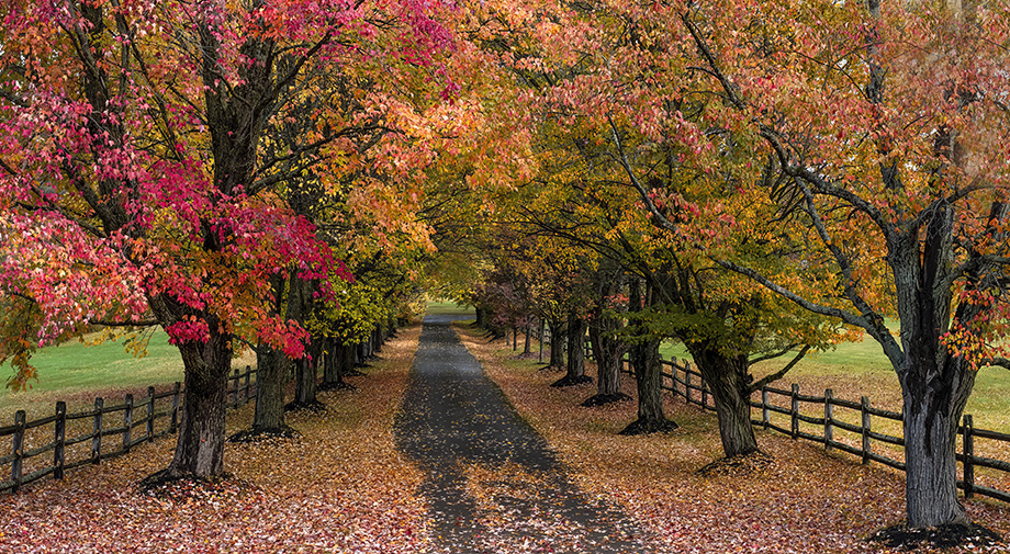 Charles, I love the three leading lines you have at left, center, and right. There's something about a tree lined road that's so appealing! You captured the color well and they are saturated perfectly. It's a lovely fall scene that is wall worthy! IMHO, I would use the clone stamp to add foliage at top right and get rid of the gray sky and crop in from top left to get rid of some sky there. Then I would suggest a vignette to your taste to bring the eye to focus more on the road. Nice capture! |