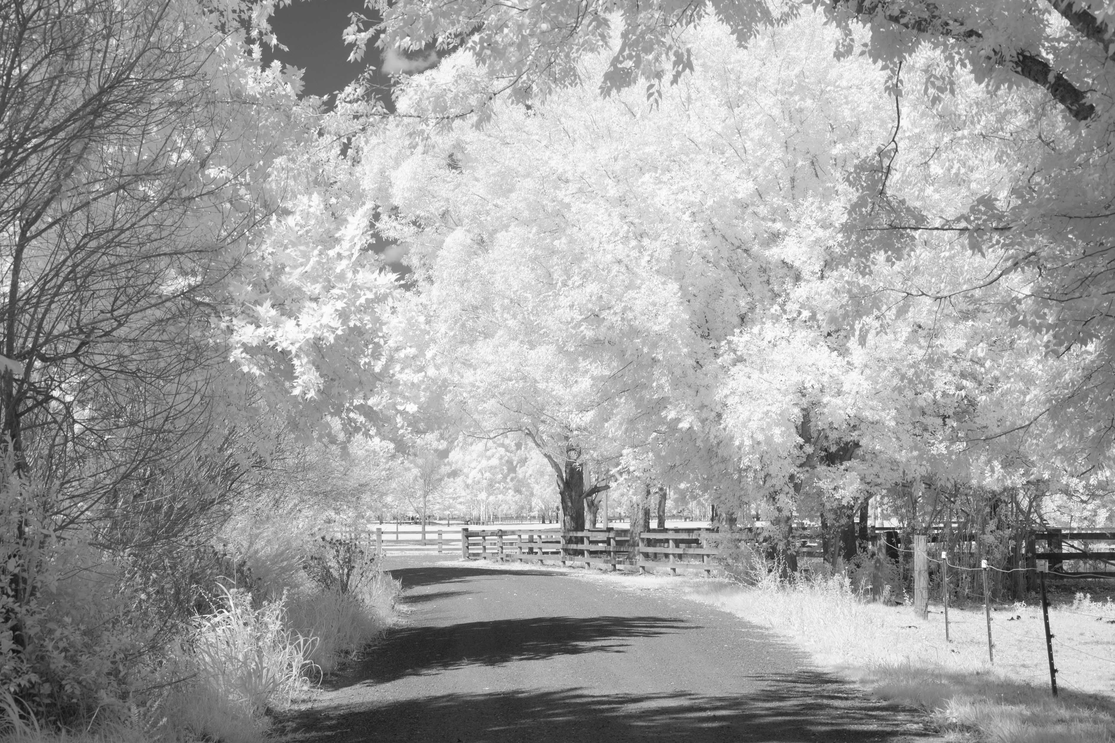 Infrared is a perfect choice for this image, and you have presented a good composition. IMHO some cropping could do away with the distracting top right corner. Though the sky at the top left mirrors the grey color of the pavement of the drive, I would ask if the sky is necessary or if the image should be cropped down from the top to remove most of it (see below). The tonal contrasts are wonderful, and the road serves as a leading line through the image. The tree branches at the left point back into the image, which is good. Overall, an impressive infrared composition! |