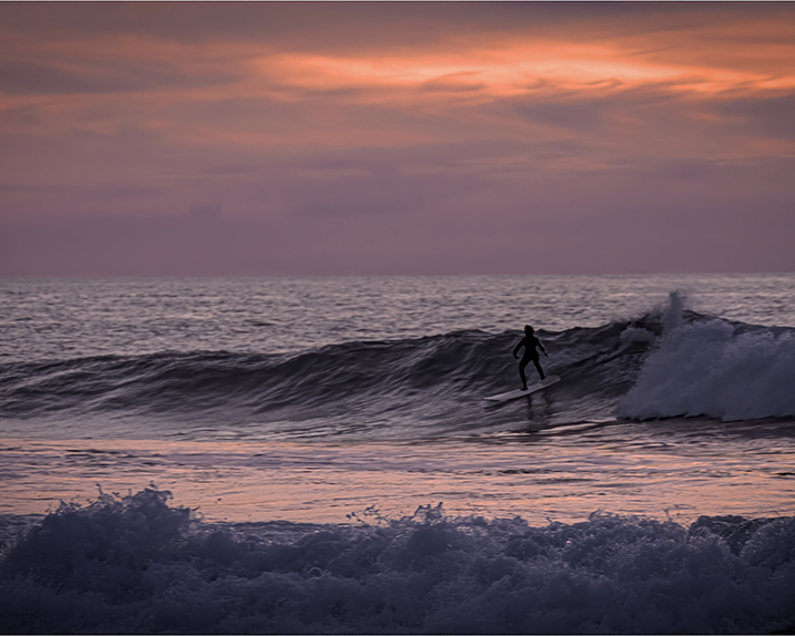 Charles, you certainly enlivened this image! I love the colors in the sky. Your decision to silhouette the surfer works well for a contrast between him/her and the white of the wave to the right. You also have a contrast of bright/dark from the front to the back creating horizontal areas across and through the image. The wave at the right is balanced by the wave at the bottom left. The horizon line looks level. I would suggest dodging the top of the wave areas where there is reflective light to bring a little more contrast into the image. I understand your wish to have a 16x9 expansive crop but I think an 8x10 crop would better suit this image, so the bottom left wave points the eye back to the surfer instead of tempting the eye to wander off the image to the left. I haven't shot surfers much at a beach as I'm only near a Great Lake! |