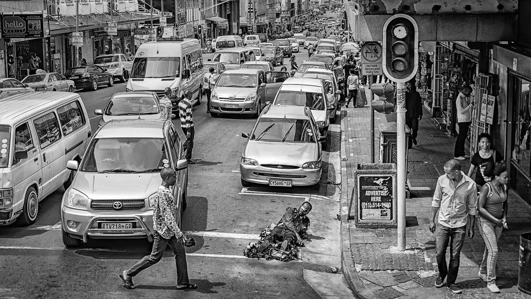 The decision to present this photograph in black and white is both deliberate and effective, lending a timeless quality to the bustling street scene in Johannesburg. The composition is dynamic, with a palpable sense of movement. The figures in the foreground are thoughtfully arranged, each occupying distinct space without overlapping, which maintains clarity and visual interest.