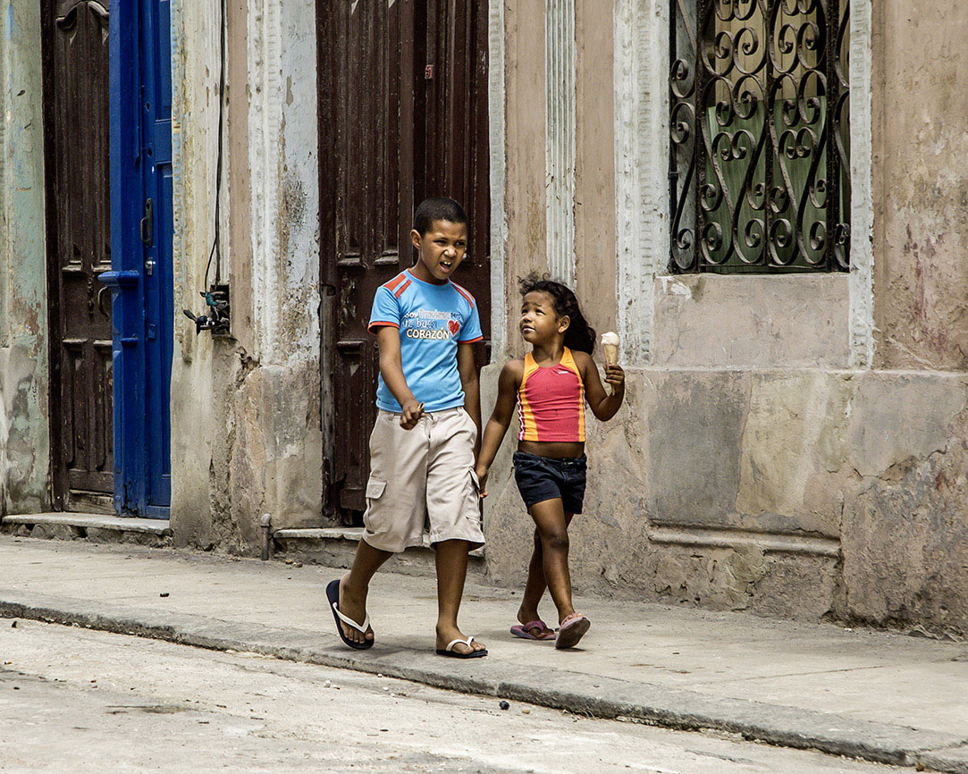 The image stands out for its use of prominent vertical and horizontal lines, which add structure and balance to the composition. The curb stone acts as a compelling leading line, guiding the eye naturally through the scene. I also appreciate the placement of the white vertical element directly behind the girl with the ice cream cone, which helps frame her and adds visual interest.