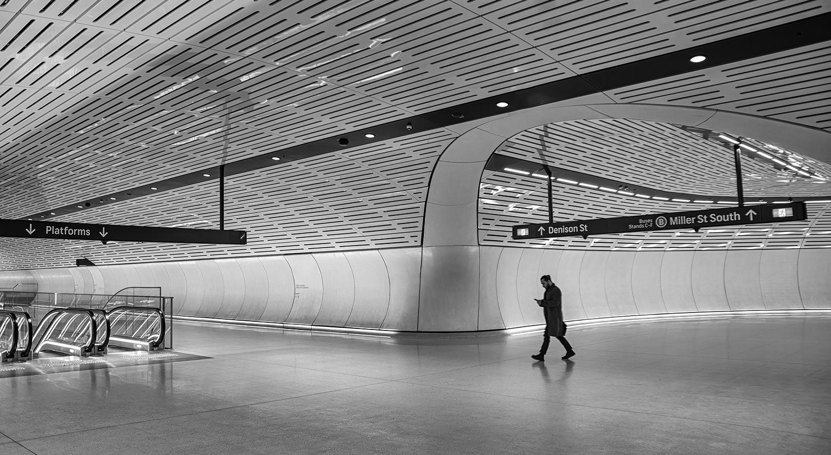 This image stands out for its evocative atmosphere. The expansive station surrounds a solitary figure, emphasizing the contrast between the vast, empty space and the individual within it. The setting's concrete and metal elements evoke a sense of isolation, while the man - absorbed in his cellphone - appears to be momentarily escaping this urban solitude. The artificial lighting casts ambiguity over the time of day, which further enhances the feelings of loneliness and sterility present in the scene.