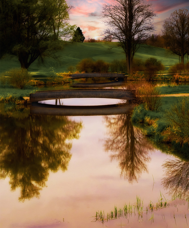 Gorgeous reflection, love the scene and its peaceful mood. Two elements distract me a little, the bright green grass is overpowering a bit and distracted me from the lower part / the reflection. I hope you don't mind, I played with it a bit to lower the grass saturation and change the hue to be more harmonious with the lower part. Changed the sky as well to match the mood, opened the shadows a little on the 2nd bridge. |