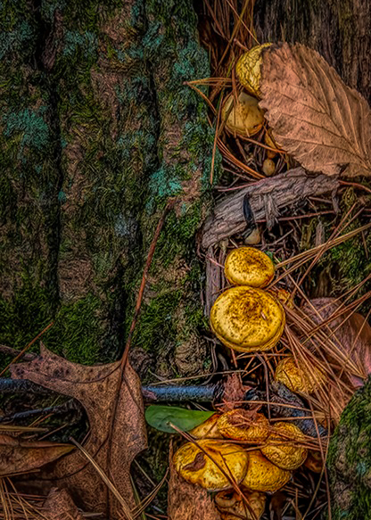 Trey - interesting image. The shrooms seem to be vying with the leaves and tree bark for your focal point. A slight crop and vignette might help focus the viewer's attention on the shrooms. |