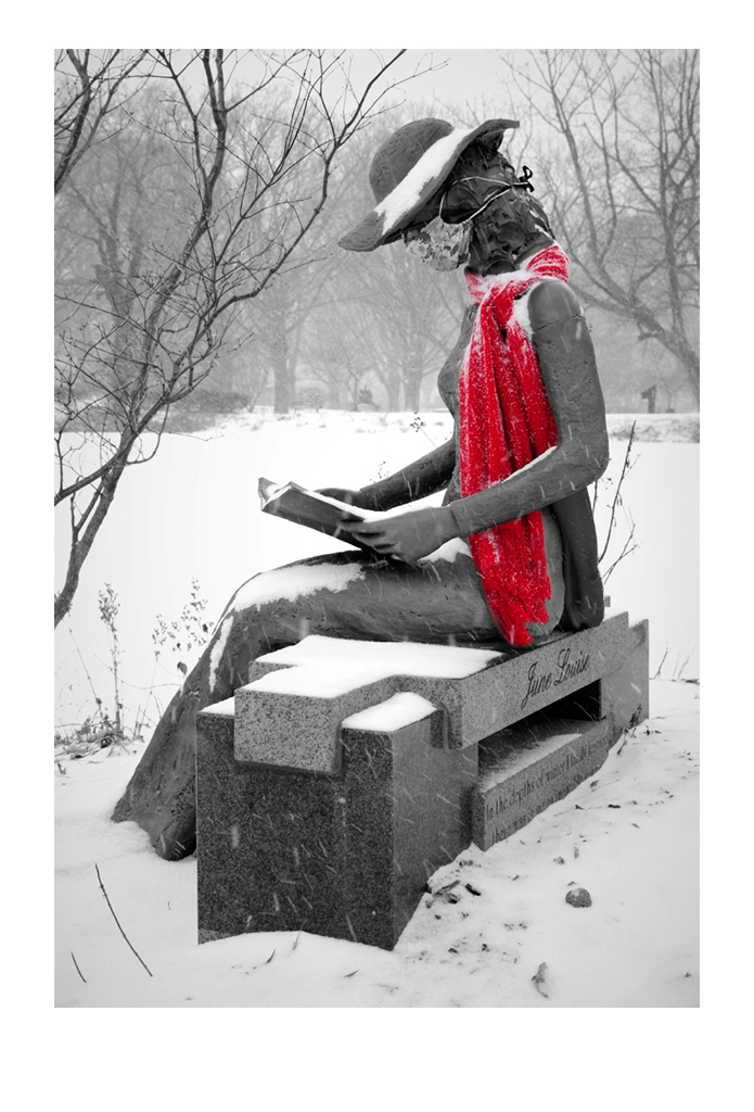 Jay - nice job! I might have made the whole image B&W, and then put the red back in the scarf for a bright spot as that is what you are bringing attention to (see below). My idea for B&W is more to adjust the color of the branches which are light and distracting when in color. While I am not normally a proponent of the one color in a B&W, I think it might work here, or just a plain B&W. |