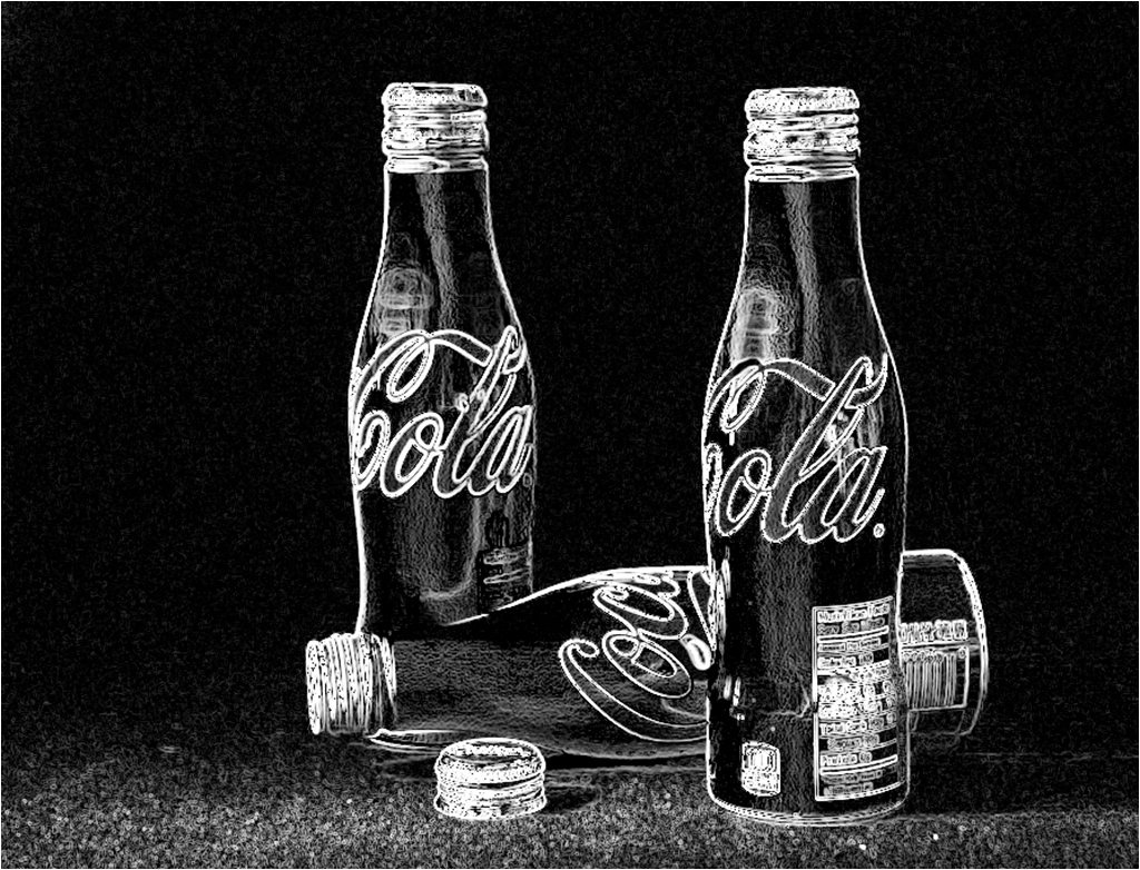 I like the concept of one horizontal Coke bottle, with the others vertical. The idea of turning then into a monochrome jigsaw puzzle is indeed a creative concept. I certainly agree that it would be evil to give someone that puzzle to solve. (unless of course you did not want them to bother you for a long time.) I'm not sure that I would be quite that evil. My old eyes were bothered by the merger of all the black. In my version I separated the bottles using the find edge filter. A new BW layer was created ad modified for the infrared effect. I then inverted the image, and moved the bottles a bit off center. For purposes of my commentary, I did not think it helpful to use the stained glass filter, as that might have confused the point of my comment. |