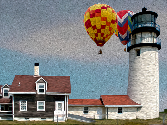You have created a nice, well exposed image that will help you remember your visit. The balloons help to fill out an otherwise blank sky. If this was my image I would have: substituted a bit of clouded sky; varied the oil paint filter; deleted the sign in front; and cropped more of the left side of thee building, so the eave corner crop did not look like an accident. I have redone the image, to give you an idea of what I mean. |