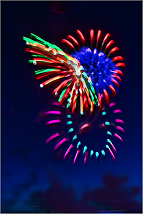 Brian, thanks for your comments. I think ou reversal does indeed make a stronger image. That bright spot, caused by another fireworks shot, was distracting but i left it in to act as an anchor. I like Susan's suggestion of an uneven black cloud on the bottom. |