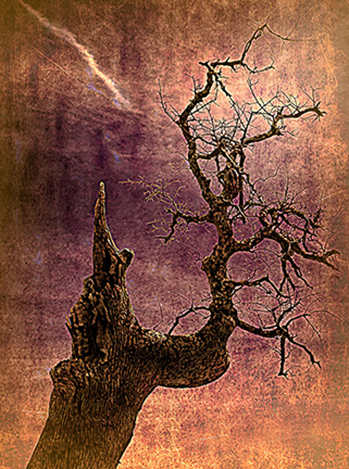You have taken an ordinary image and through your creative imagination turned it into an interesting image. I like your use of color tonality for a border. The combination of your color choices and the texture adds up to a spooky effect. The inconsistency in the direction of light source is consistent with the spooky feel of your image. The lightning bolt acts as an enhancement of the feeling. Just one minor nit, the straight line, or crease, at the top of the tree distracts me a bit, and to me appears inconsistent with the theme. I eliminated the line to show what I mean. |
