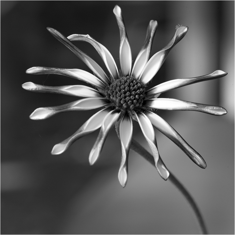 Hi Tracy. You have made a nice image, and proven that every flower must be tack sharp. It is very difficult to convert a flower to monochrome, and keep it looking good. You have done a fine job with your conversion. The stem is placed at a nice angle and leads my eye straight to the subject. At my first look, I thought it was a sculpture, because it had such a nice tonal range. If this was my image I would have cropped out the entire left side, because to my eye it detracts from your image. |