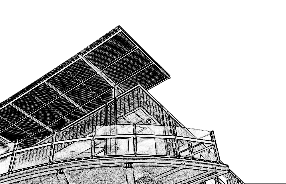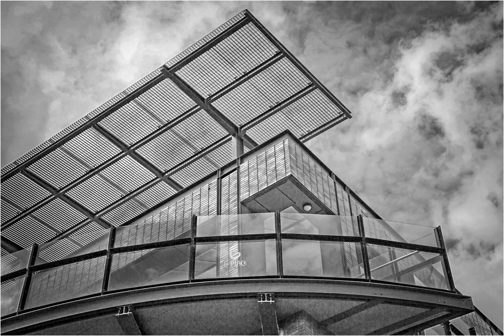 To my eye the sky detracted from the graphic building. I played a bit and go rid of the sky. It gives a different look to your image. I am not saying it is better, just different. |